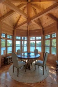 One significant benefit of using timber frame in your home is that it can work with any type of construction. From the outside, you can’t tell that this octagon shaped room has beautiful exposed timber framing on the inside. Looking to add on to your current house? Try an octagon design to add architectural interest.