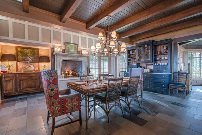 This is perhaps one of my favorite dining rooms. It features an old-world vibe with its decor and beautiful exposed beams above. What is unique about this dining space is the fireplace. Imagine enjoying a nice Thanksgiving meal with your family while fireside. The dining room is in its own space, but the kitchen isn’t too far away.