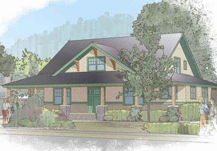 Like the Bungalow 1, the Bungalow 2 is designed for modern living, while drawing its aesthetic inspiration from the turn-of-the-century Arts and Crafts Movement in architecture. This particular plan is a nod to the Prairie School (of which Frank Lloyd Wright was a prominent member) incorporating typical exterior elements including piers to support the large wrap-around porch roof, contrasting wall materials and perimeter windows. The open layout makes this medium sized home feel larger than it’s square footage would lead you to believe.