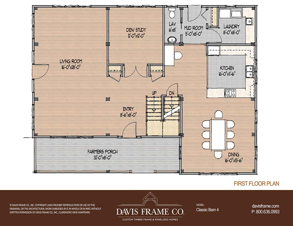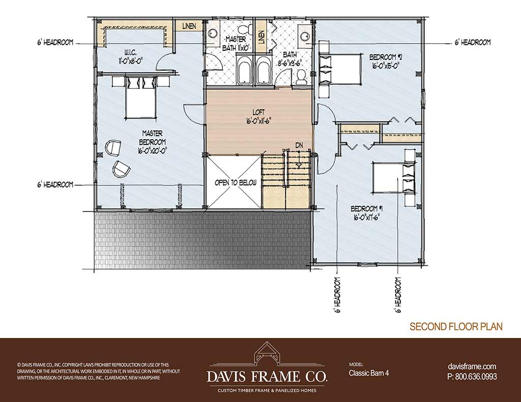 Rocking chairs and porch swings could easily adorn the farmer’s porch of Classic Barn 4, leading directly into an open first floor that features an adjacent kitchen and dining room at one end and living room at the other. The den or study at the back of the house can look out on rear gardens or patio. The second floor features a master bedroom with ensuite full bath and two bedrooms that share a second full bath.