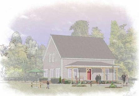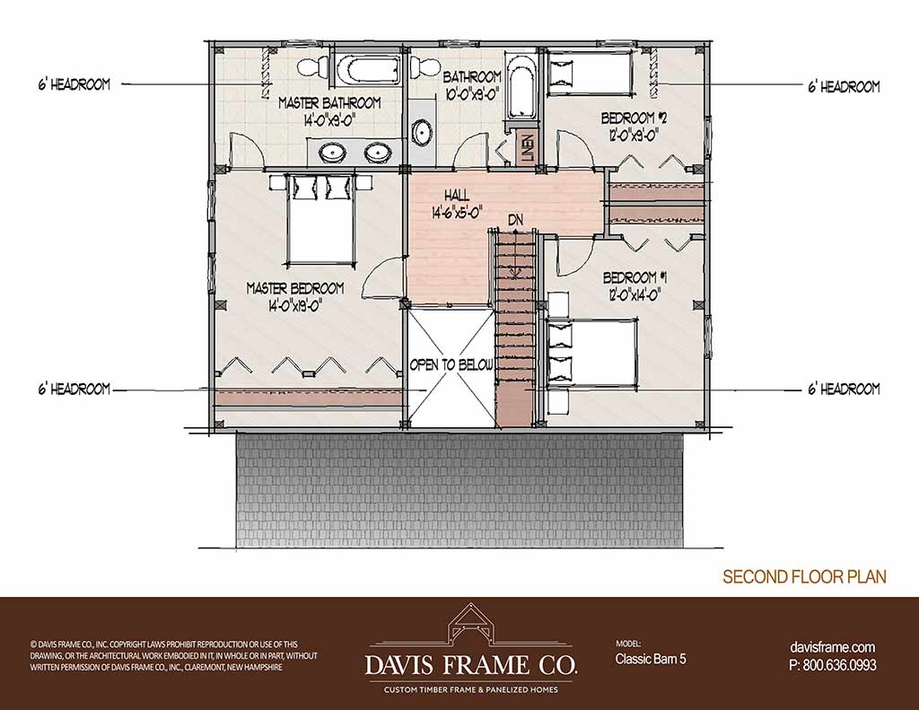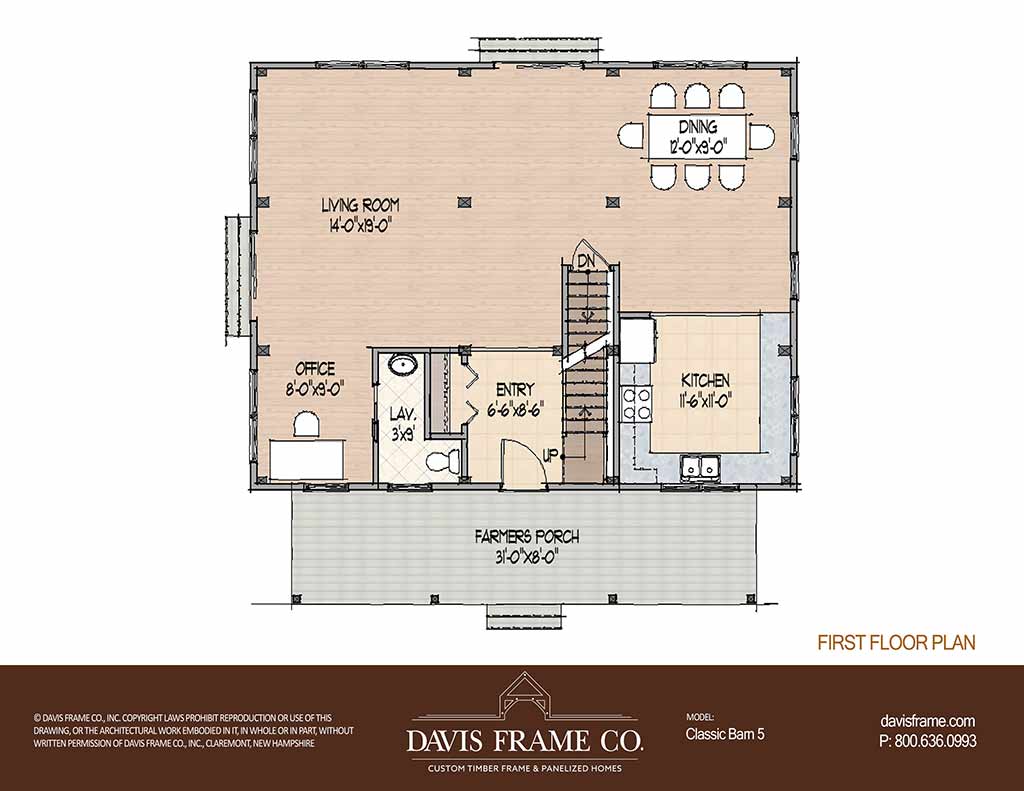 A wide roofed porch shelters the entrance to this simple and classic design. Two bedrooms, full bath and a master bedroom with full en-suite bath are nestled above an open first floor featuring an adjacent kitchen and dining room, a large living room, half bath, and an office.