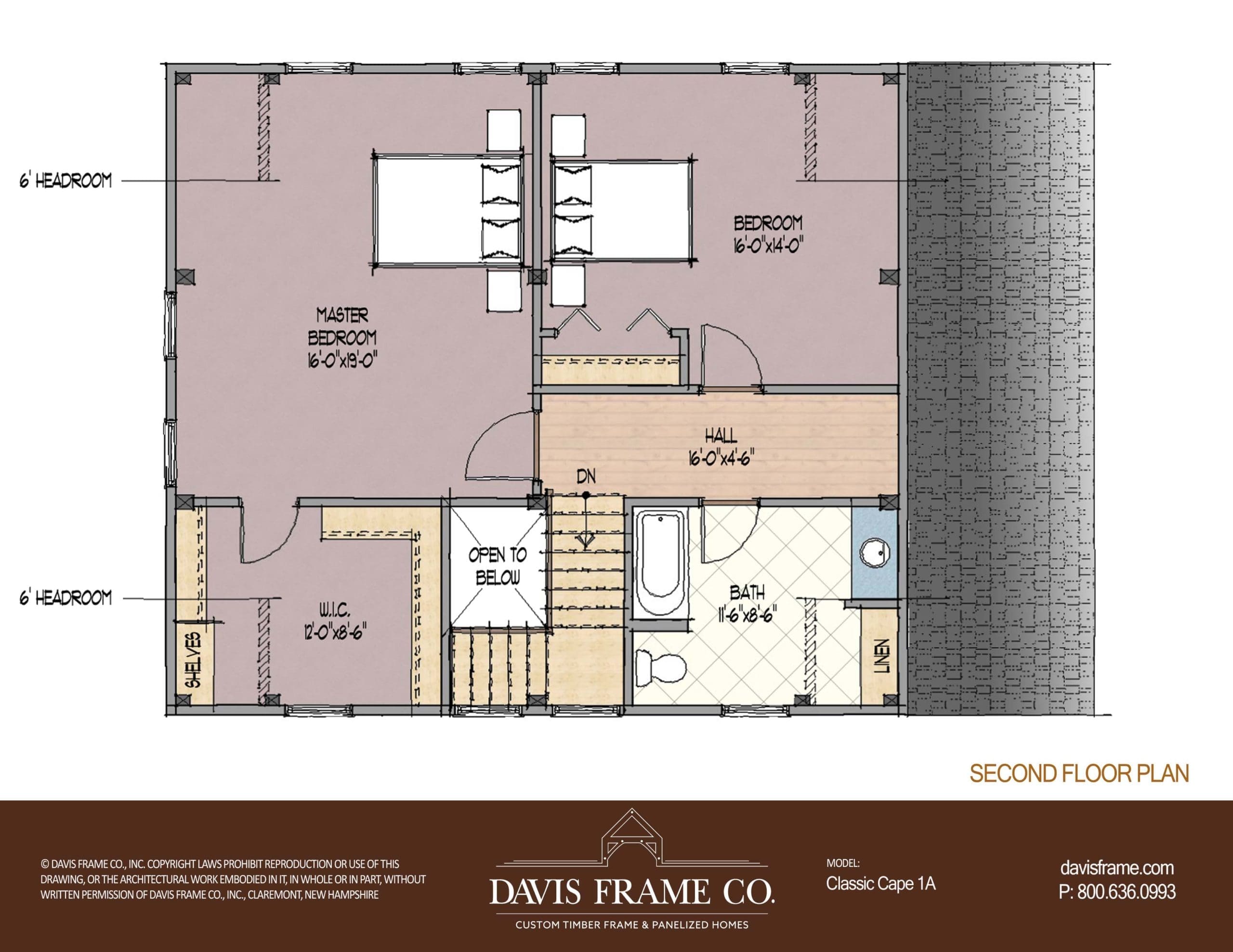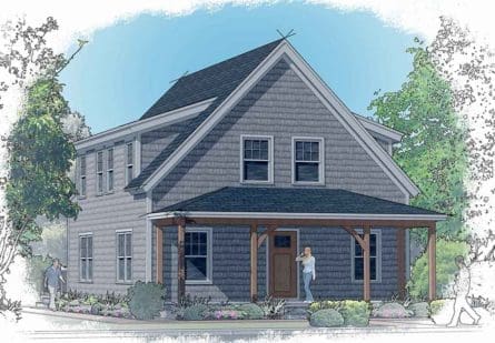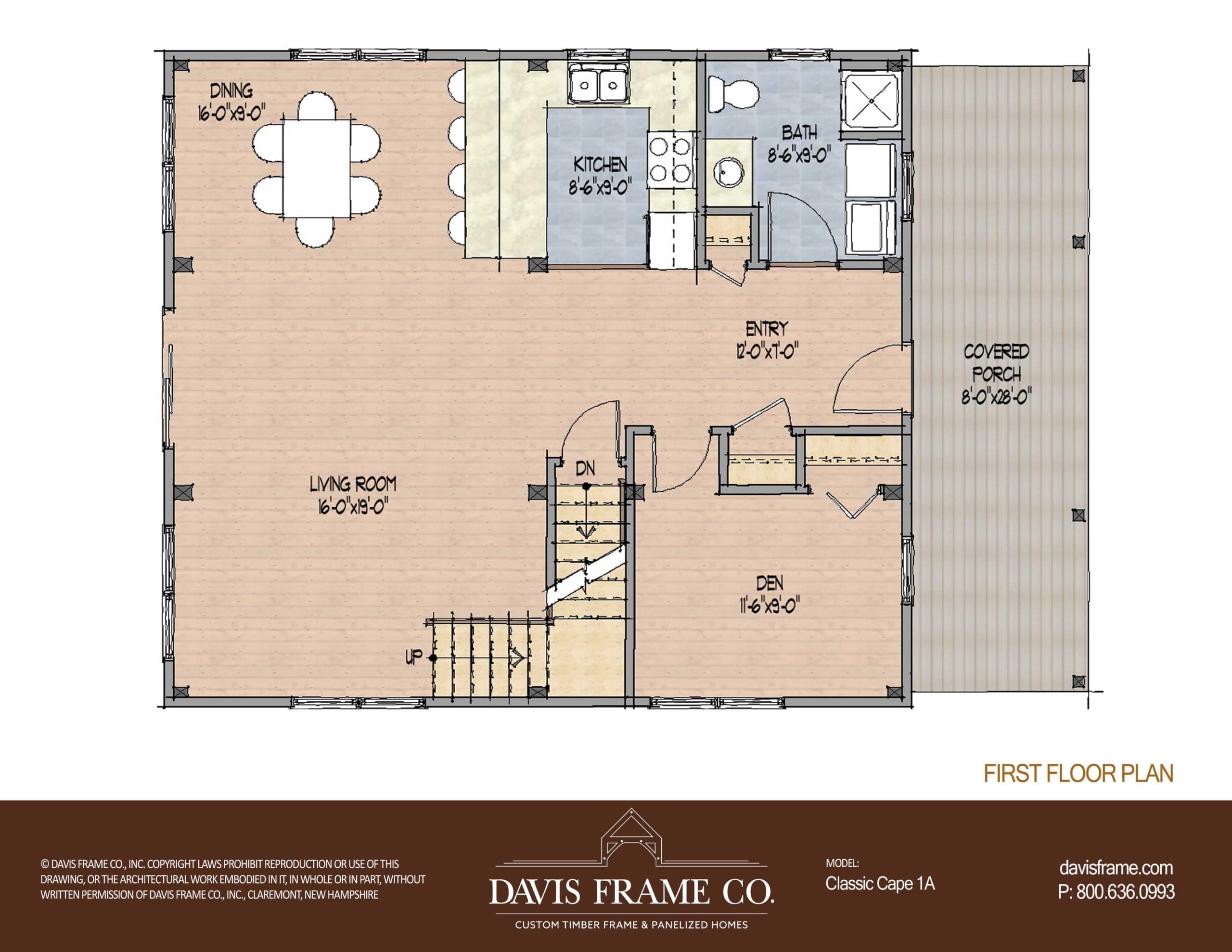 The Classic Cape 1A is true to its architectural roots with a steeply pitched roof and central staircase while adding a few twists on the traditional design by placing the front entrance on the gable end. Our version adds a covered entry porch that leads into a central kitchen with an adjacent three-quarter bath, a cozy den and an open plan for the living and dining rooms. The second floor shed dormers create ample space for a master bedroom with a walk-in closet, a second bedroom and full bath.