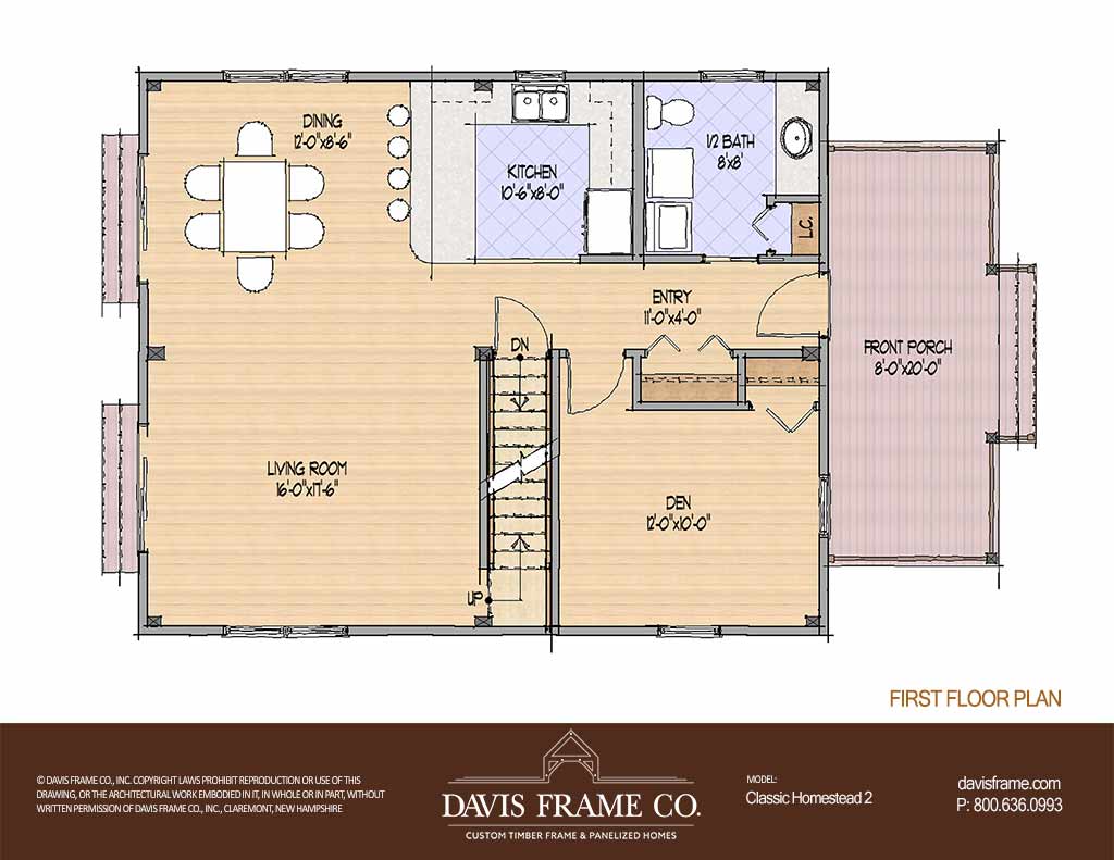 Inspired by the simplicity of homes built by early homesteaders, our Classic Homestead Series features simple rooflines, informal compositions, modest interior spaces and charming second-floor rooms with sloping walls and dormers. A perfect lakeside cottage or retreat in the woods, this home has a welcoming timber-framed front porch and a well-designed interior living space. The first floor is where you’ll find the living and dining rooms, kitchen, and a den or study that can also function as a guest bedroom. A convenient laundry and half bath near the entrance round out this spatially-efficient design. There are two bedrooms and a full bath on the second floor.