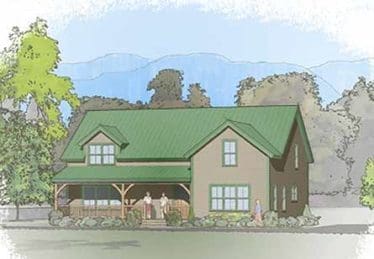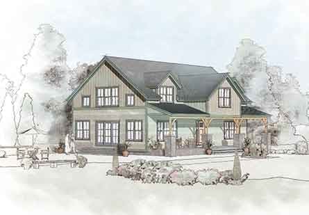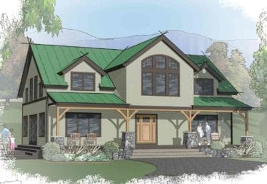 Stonework, steep roof, simple materials — all are hallmarks of homes made to withstand the rigors of mountain living. The Mountain Haus Series is designed to maximize views and is suitable for both sloped and flat terrain. The Classic Mountain Haus has a very flexible floor plan to accommodate active families and those who like to entertain. With a central stair separating the living room from the dining room, kitchen and a half bath, Mountain Haus 1 offers an open first-floor plan. A lowered counter with bar stools adjacent to the kitchen encourages conversation with the cook and creates a comfortable place to have breakfast. The second floor includes a master suite with a linen closet and two bedrooms with a full bath. An additional open room that can be used as an office or entertainment area is cantilevered over the front porch.