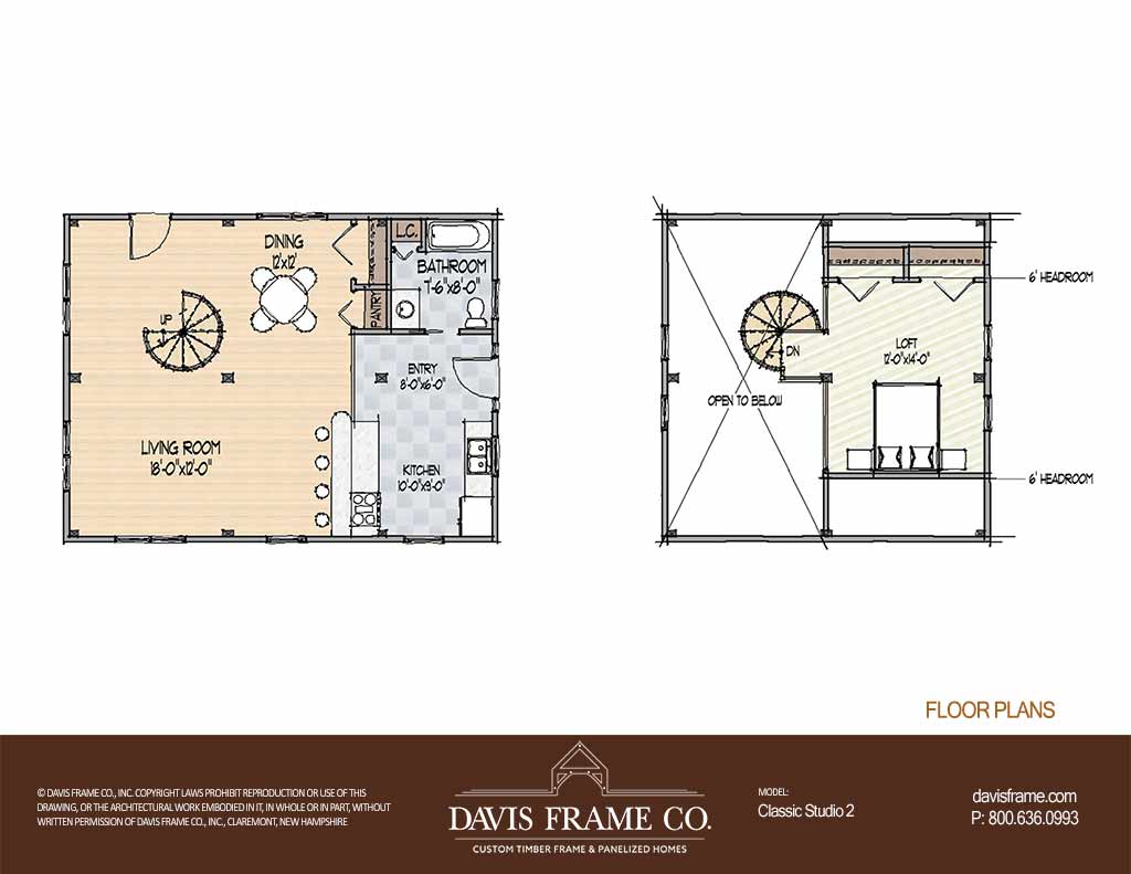 The Classic Studio 2 makes for a wonderful guest house or simple retreat in the wilderness. These versatile studio spaces suit a wide range of uses. For artists and musicians, the studio home can function as a combination working/living space. A modest, livable space, it also works well as a summer vacation home, guest house or outbuilding. This “what you see is what you get” floorplan includes an open living and dining room, plus kitchen and full bath below with a loft bedroom accessed by a spiral staircase upstairs.