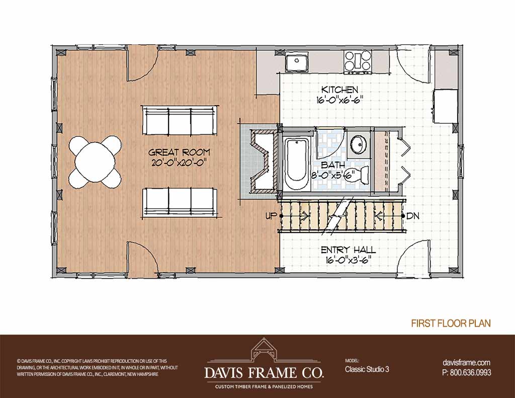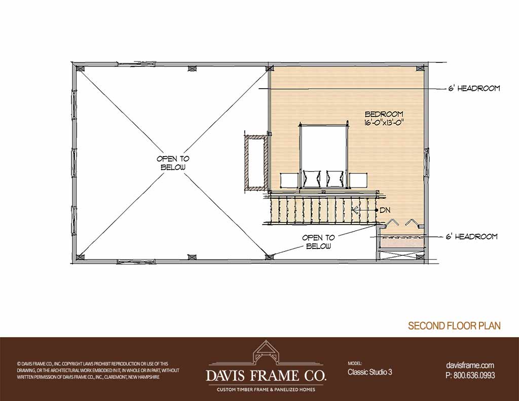 These versatile studio spaces suit a wide range of uses. For artists and musicians, the studio home can function as a combination working/living space. A modest, livable space, it also works well as a summer vacation home, guest house or outbuilding. The Classic Studio 3 offers a lot of living in a modest space. A wall of windows in the cathedral-ceiling great room and two sets of French doors with sidelights provide plenty of light brings a sense of the outdoors inside. A timber collar tie spans the great room, providing visual interest. A full bath is tucked away between the stairs and kitchen. An open stair leads to the loft bedroom, which is spacious enough for a sitting area.