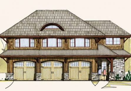 More than just a garage, the Elm Carriage House combines automobile storage and living into one compact design. The Elm features 2 bedrooms and 2 bathrooms, and a 3-car garage. A large living area with exposed timbers and an open kitchen complete a dramatic interior. Exterior timber, stone, board and batten, and shingle detailing complete the feel of this perfect rustic getaway.