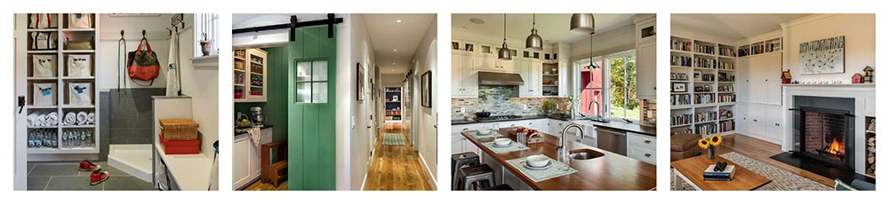 This collage of photos showcases a few first-floor highlights of the original Dash Landing’s first floor. The first picture is the mudroom/dog washing station, a nice touch for New England pet owners. The second photo shows the unique walk-in pantry and the corridor leading to the master bedroom wing. Then there’s the kitchen with its clean design with a modern flair. Last, the living room has a more traditional “country” style, similar to what you would find in an old New England farmhouse with a built-in bookcase and traditional recessed fireplace. What would you do with these spaces?