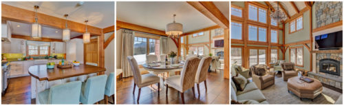 There are two entrances, the foyer in the main portion of the home and the mudroom. Living in New England, with the constant change in the weather, the mudroom is often the primary entry. This mudroom is a good size and features a long bench with storage space below and hooks above to hang coats and ski gear. Entering the house from the mudroom, immediately draws you to the beautiful kitchen, which flows right into the dining room. The dining room captures a view of the spread of mountains nearby. The dining room and kitchen feature a large vaulted great room showing off the beautiful exposed wooden beams and white tongue and groove board above. The view of the mountains extends into this room through the expansive wall of windows.