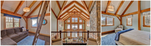 The second floor features a gorgeous loft that overlooks the first floor. The loft captures a view of the timbers and a view of the mountains through the wall of windows. To the right of the loft is a guest suite similar in layout to the master below. To the left of the loft are two kids’ bedrooms, both featuring accessible play lofts by a ship’s ladder. This is a new trend we see with vaulted bedrooms. In addition, another full bathroom is on the second floor for the kids to share. In the loft area is a discretely hidden laundry area featuring custom white cabinetry and millwork.
