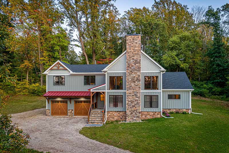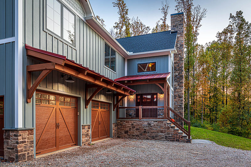 Last but not least is a closer view of the finer details of this New Jersey timber frame home’s exterior. To enhance the craftsman style feel, the homeowners included stone veneer around the foundation, board and batten vertical siding, and gorgeous wood accents. The combination of the blue color siding along with the stone and wood accents truly makes this exterior stand out.