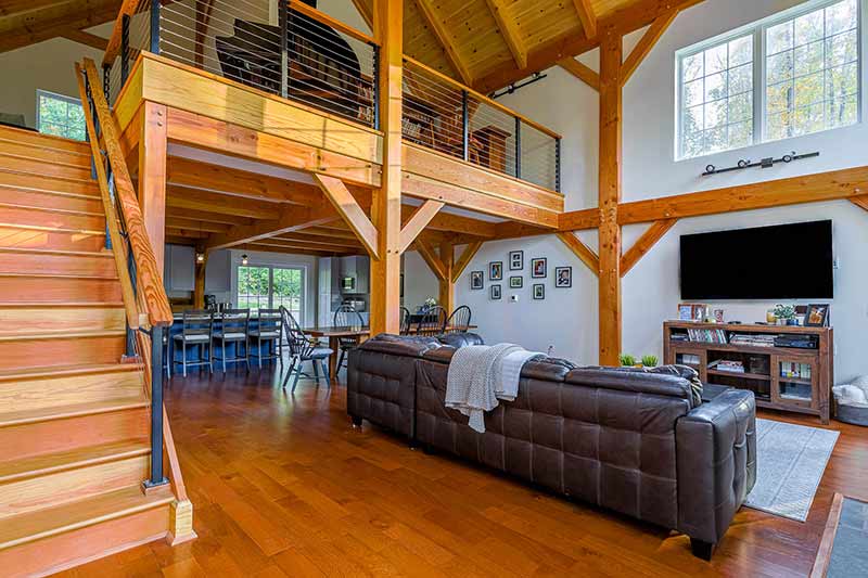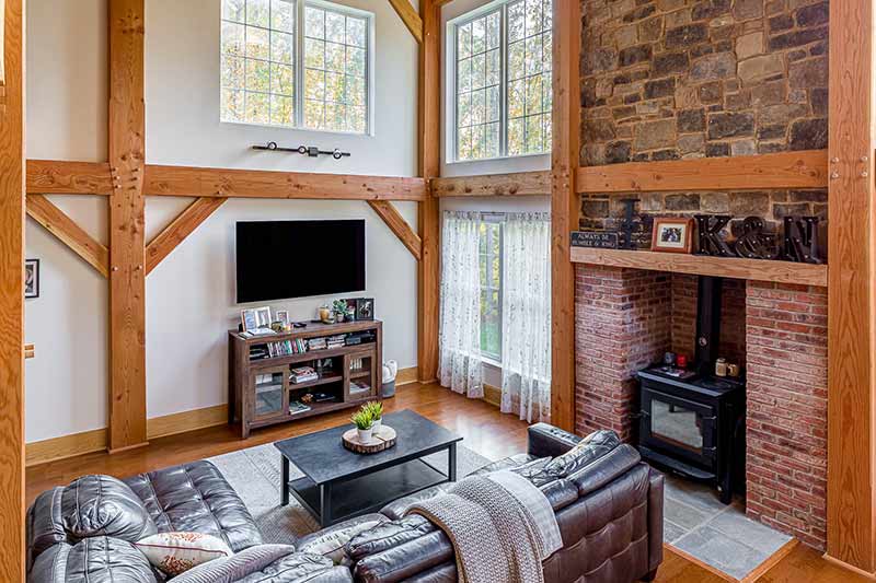 The clients constructed the home using the hybrid technique, utilizing both conventional and timber frame construction. Timber frame construction is featured in the center core of the home – the great room, dining room, and kitchen. The rest of the house is conventionally framed. The home exterior includes some timber accents for added charm.