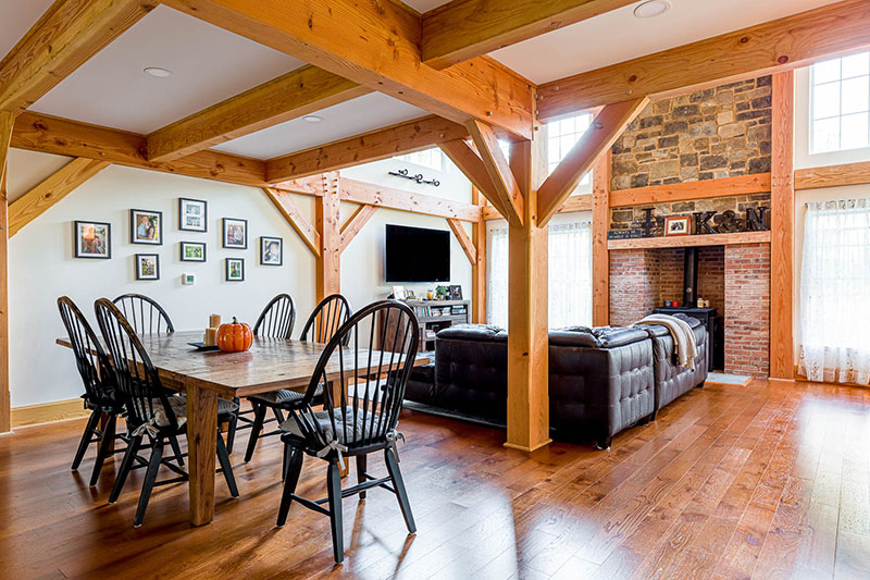 Entering the home through the covered porch, you are immediately drawn to the vaulted timber frame great room. The great room opens into the dining room then flows nicely into the kitchen creating the perfect open layout that makes the space feel spacious and airy. The great room is the only vaulted space on the first floor, which gives it an added wow effect, while the dining room and kitchen ceilings are at a standard ceiling height. Incorporating a vaulted ceiling with standard ceiling heights within a large open space helps to define and separate the spaces without needing to use a wall. In fact, this is a very common design for many of our timber frame homes.