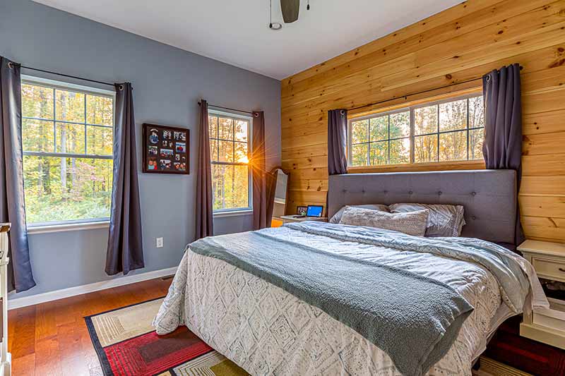 Here is a view of the master bedroom. The wall of tongue and groove board warms up the space. Even though this space does not feature timber frame, it helps to tie in the wood from the main living areas to other areas of the home.