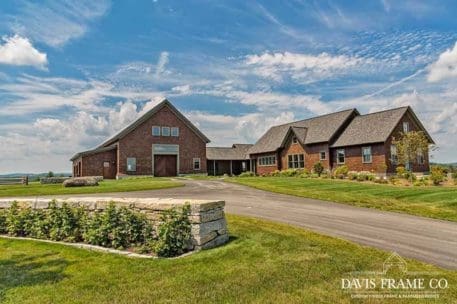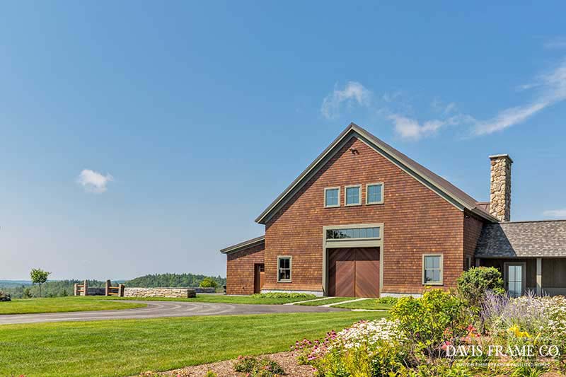 Discover the beauty of this timber frame barn! Davis Frame supplied the structural frame. The barn features 3 bays, a loft above and guest quarters. The home was stick-framed on site by the builder, and the timber frame barn structure was fabricated in our shop here in Claremont, New Hampshire, using Douglas fir timbers and traditional mortise and tenon joinery. Timber frame construction is a perfect option for barns, giving them a level of authenticity going back for generations.