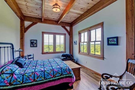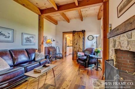 A loft overlooks the first floor and is a perfect flex space that can be used for additional storage or as a space to relax and enjoy the beauty of the timbers, and the view of the timber frame structure is quite impressive. To add to its rustic charm, the homeowners added tongue and groove pine decking to the ceiling and tongue and groove to the walls. One great perk of using T&G on both the walls and the ceiling is that it’s maintenance free – no touch-up on paint is required!