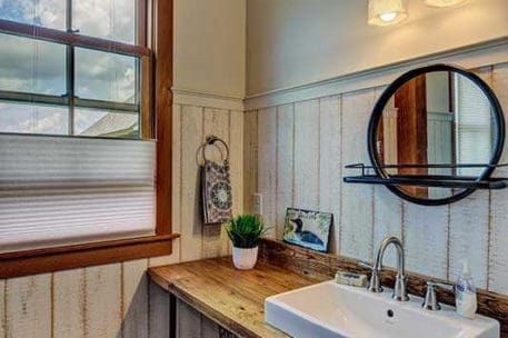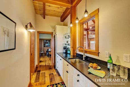 Adding to the versatility of this barn, there are guest quarters on the backside of the barn, featuring a guest bedroom, full bathroom, kitchenette, sitting area, and the homeowner’s office. Pictured here is a kitchen equipped with a nice prep space for overnight guests to prepare a snack or a light meal, and a window that looks out to the main barn and also allows for natural light to peek through. The barn also features solar panels on the roof.