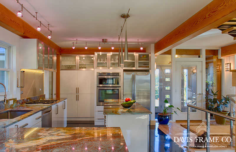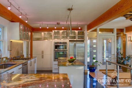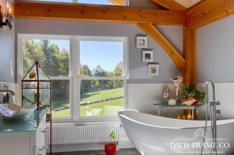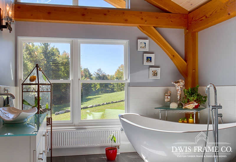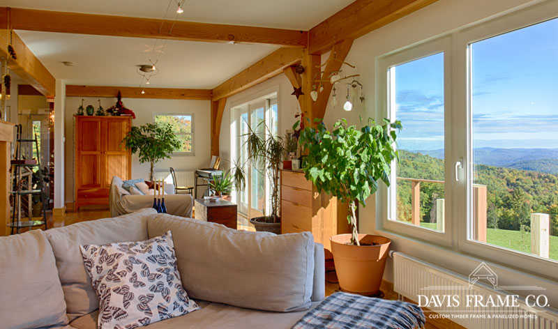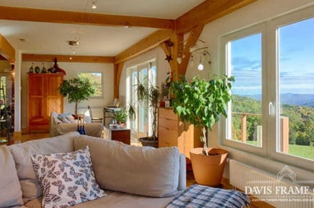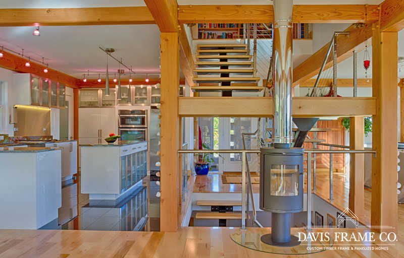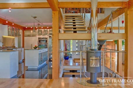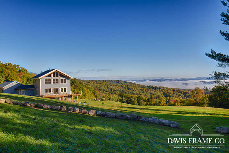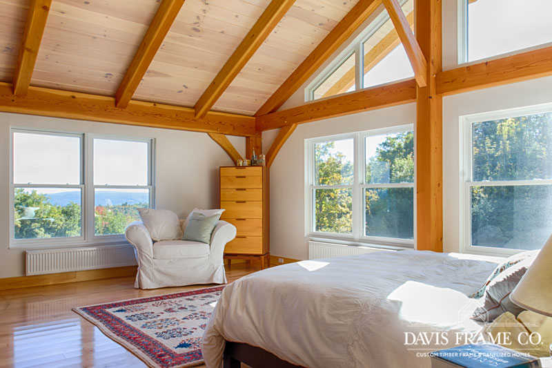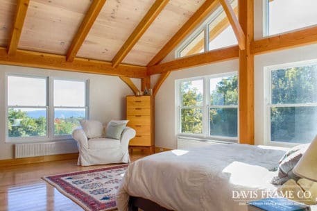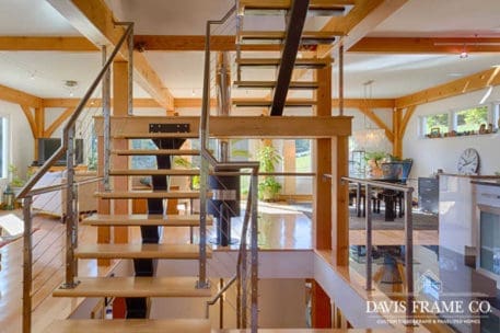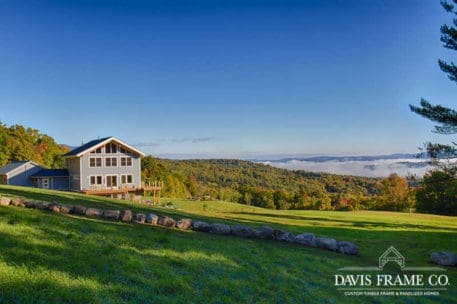 This beautiful Vermont barn home features an unmatched picturesque view of the valley below. The interior is just as stunning with an open first floor plan and is decorated with a modern touch. Our clients had two goals for their new timber frame home. First, they wanted a barn home that would blend into the Vermont landscape but also have a more modern design. Second, they wanted it to be super energy-efficient. The entire first floor is open, with no interior partition walls, including open stairs designed to be floating. The combination of the warm exposed timber frame beams and the modern touches make this a welcoming timber frame home and a perfect place for entertaining. The second floor features a grand master suite with vaulted ceilings and a wall of windows, letting in lots of natural light. Also on the second floor is a guest bedroom, bathroom, as well as a loft space that is used as the homeowner’s personal library. This home also features a walk-out basement that expands the living space. Here you will find two more guest bedrooms, a bathroom, and office space for both of the homeowners.