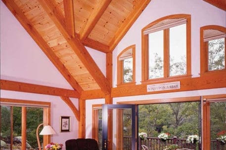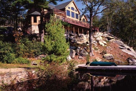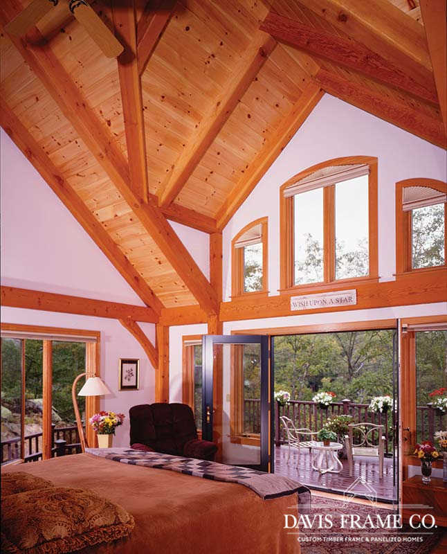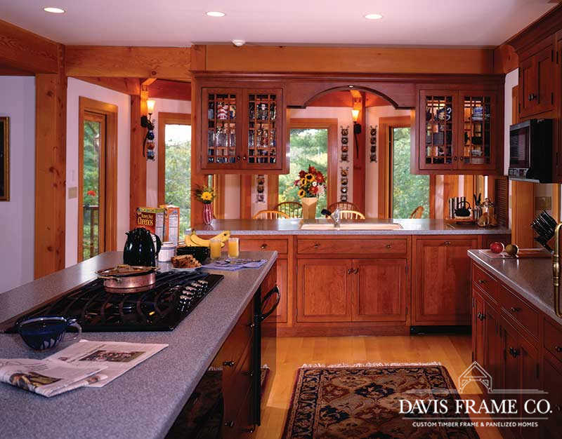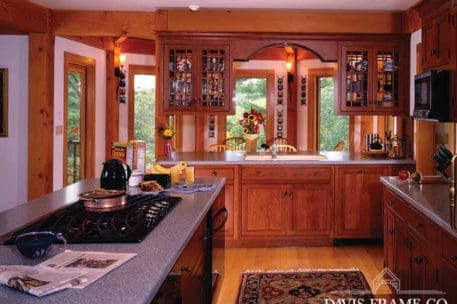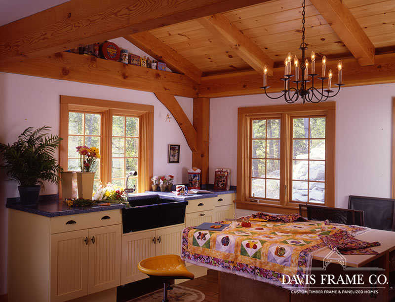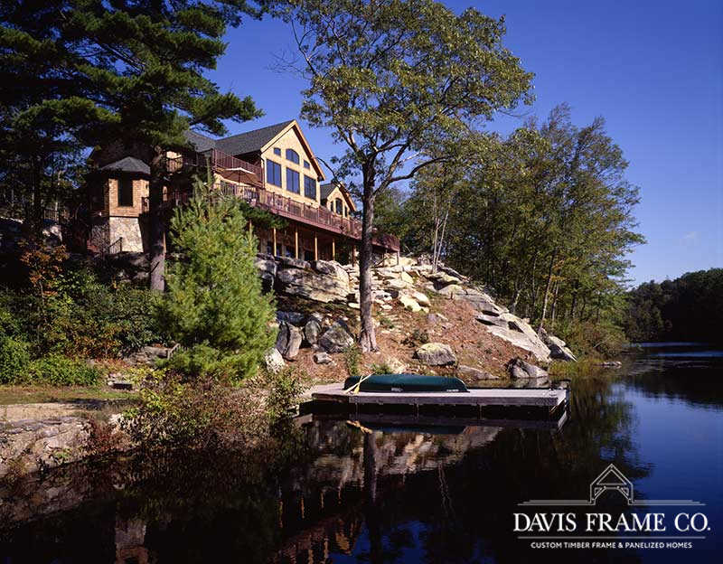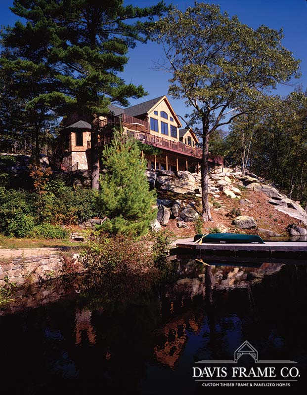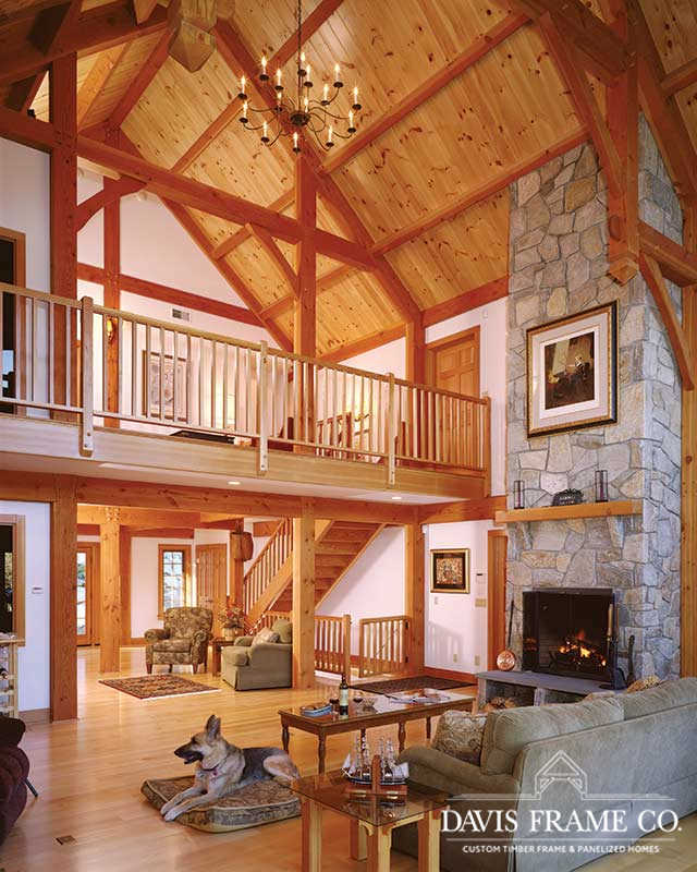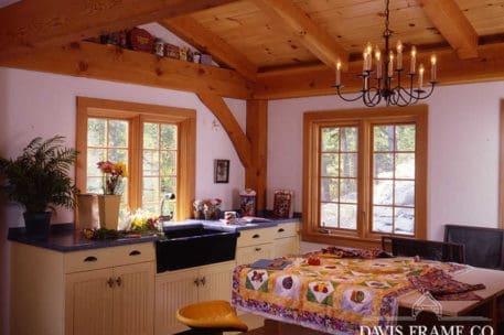 The natural color of the western red cedar shingles accentuates the beauty of this home and the property. The Saw Mill Hollow timber frame home is set on a rocky ledge overlooking a pond. With a deck wrapping around the back of the home, beautiful sunsets and quiet evenings can be enjoyed. The main section of this custom post and beam home features four queen’s post bents, one king post bent, and dramatic hammer beam bents. The hammer beams enable an open floor plan with minimal interior support posts. With a floor to ceiling fireplace, gable dormers and French doors leading to the deck, the owners can enjoy the sounds of loons from their high-point vantage.