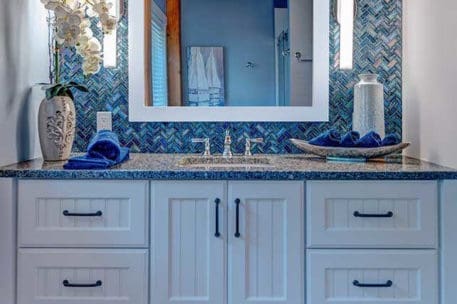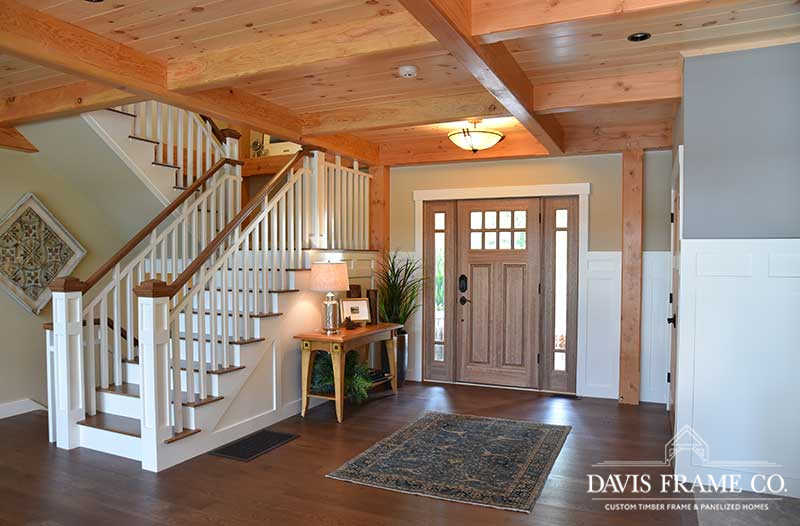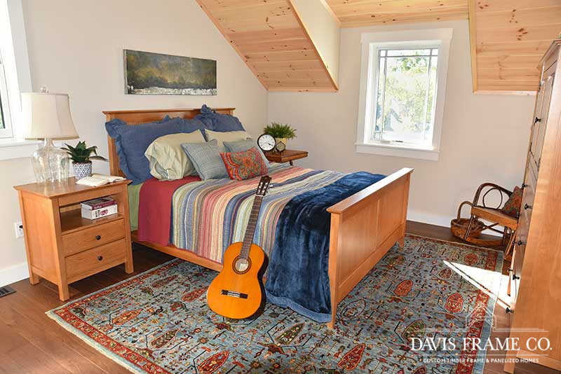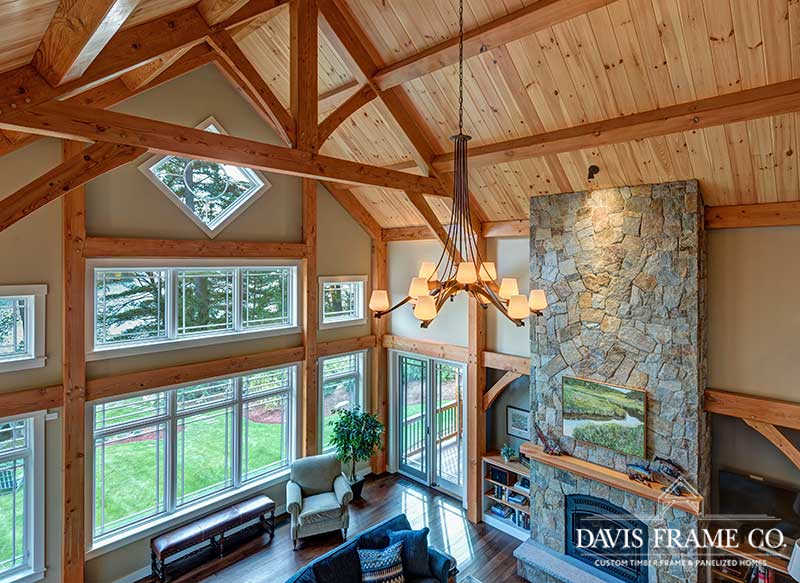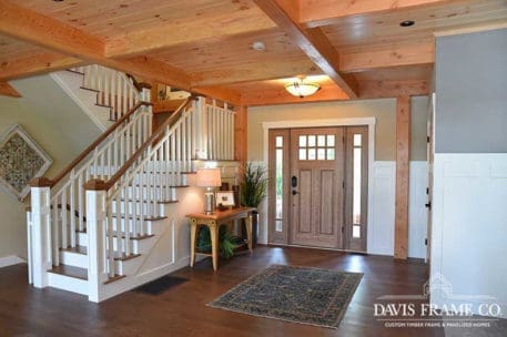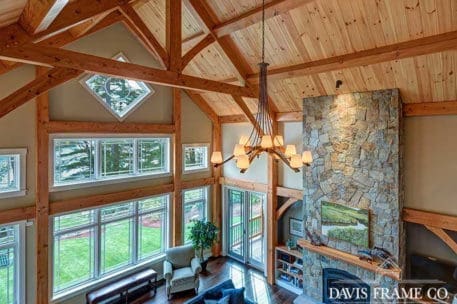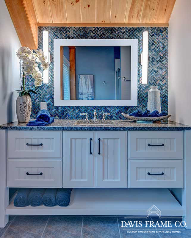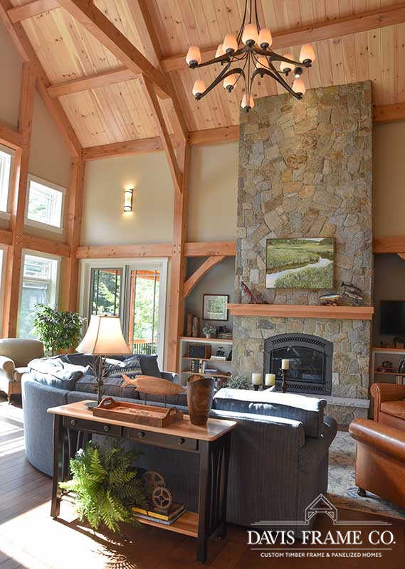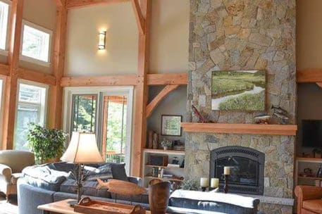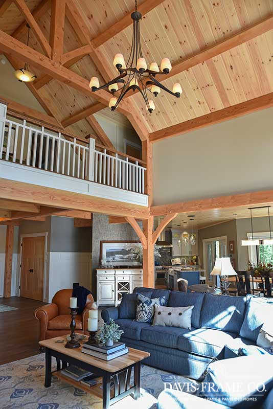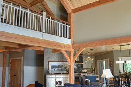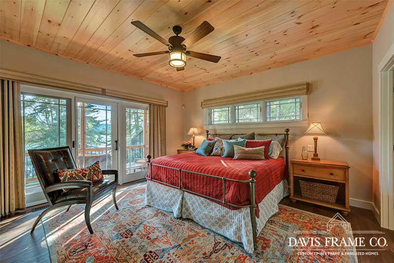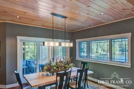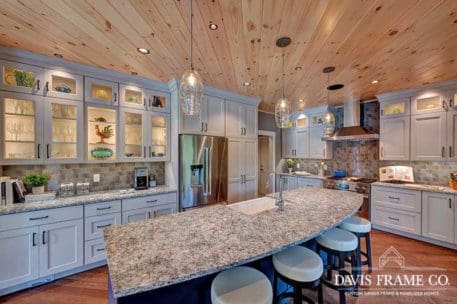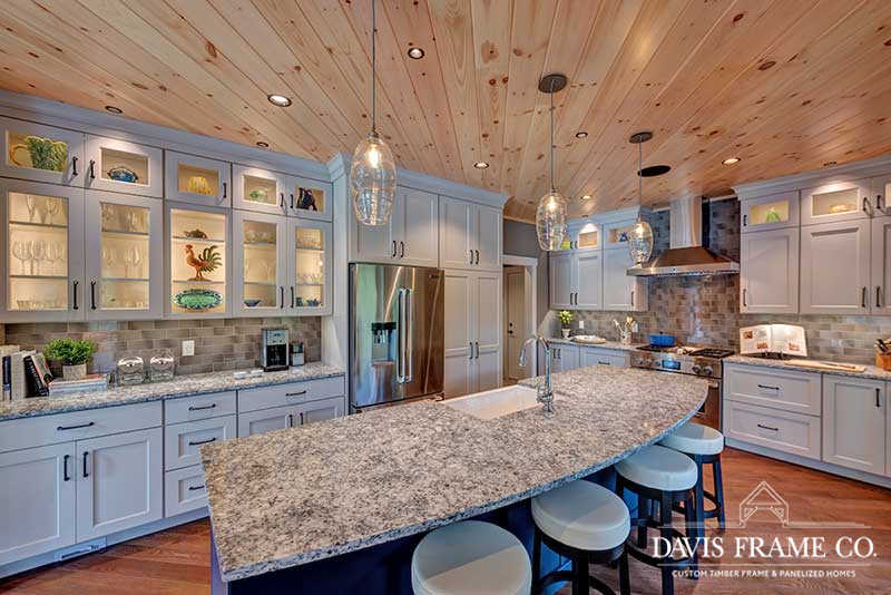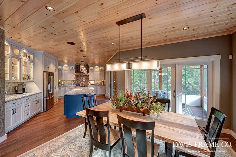 The hybrid timber frame home design features a center core timber frame that is seen upon entering the home and leads to a timber frame great room. The timber frame great room flows into the dining room and kitchen to the left. To tie into the timber frame, the homeowners extended the pine tongue and groove decking throughout the home. The tongue and groove ceiling is a common feature in many lakeside homes. To the left of the timber frame great room is the dining room and the kitchen which flows nicely into this space, allowing for a nice open concept layout perfect for entertaining. This gorgeous custom kitchen features beautiful white cabinetry and a pop of blue for the island. This adds a nice bright contrast and breaks up the rustic appeal the wood gives off. To the right of the great room is a spacious master bedroom suite. In addition, the master also features access to the deck, a perfect place to enjoy a morning cup of tea.