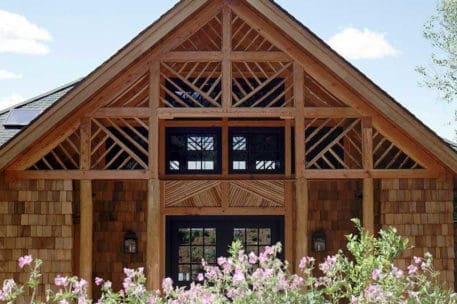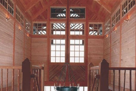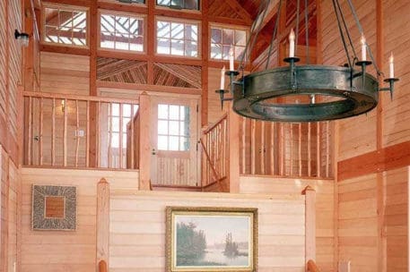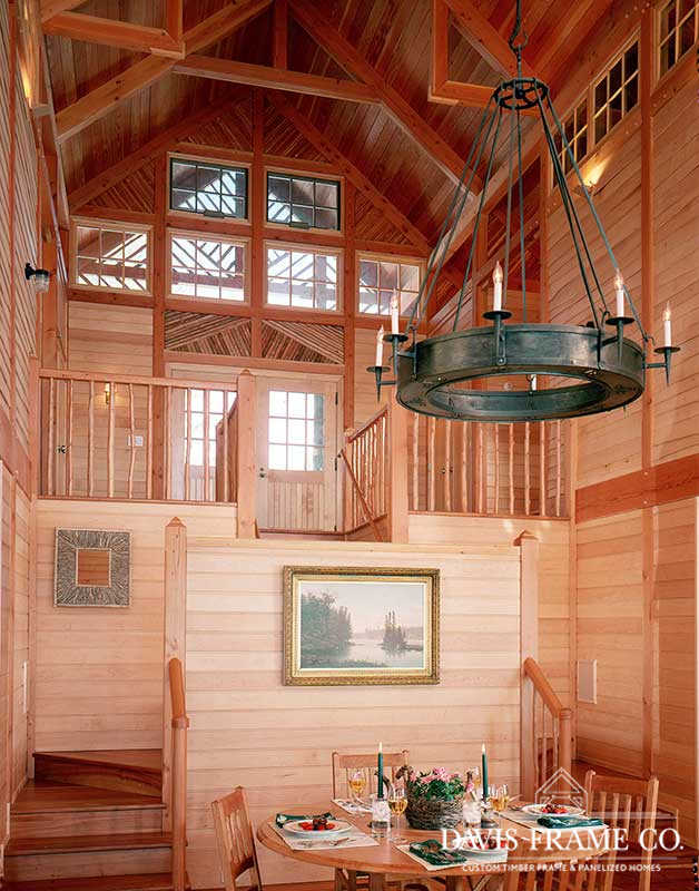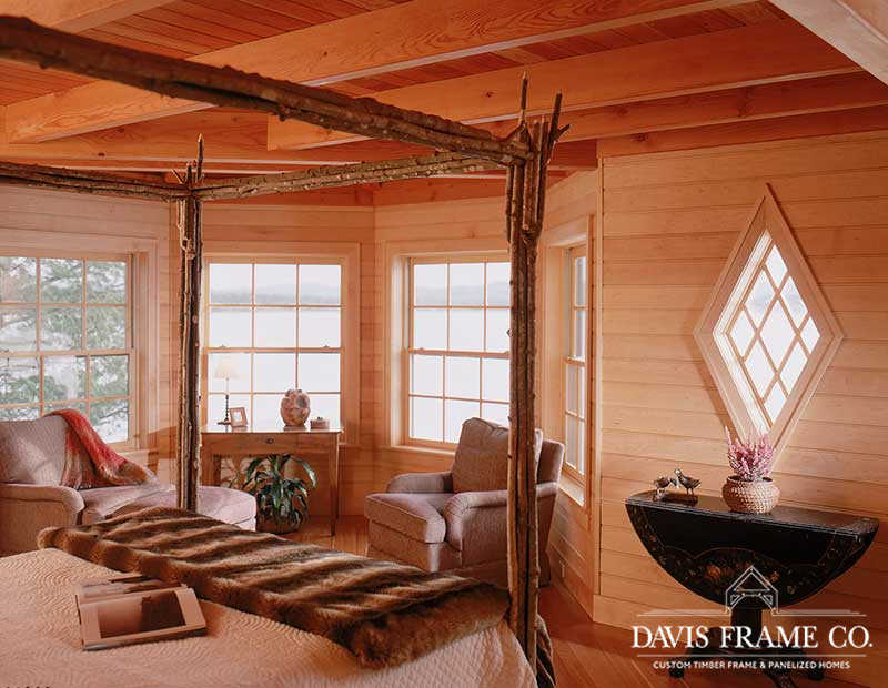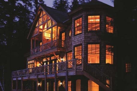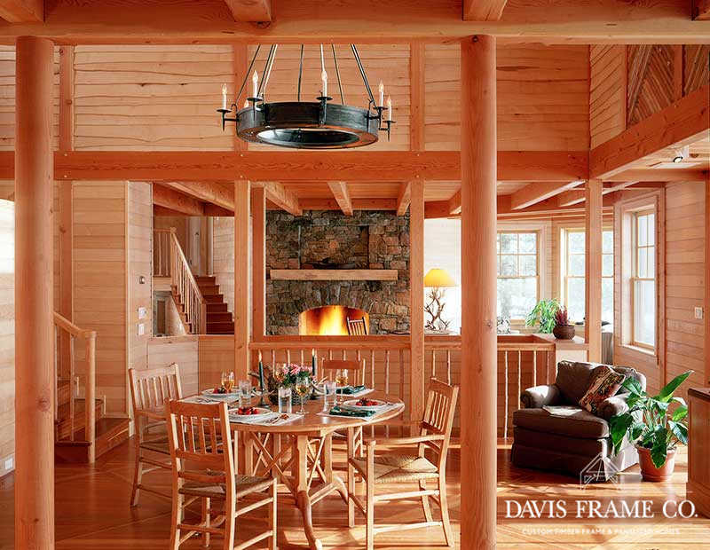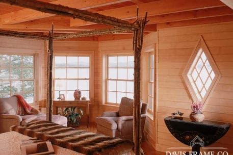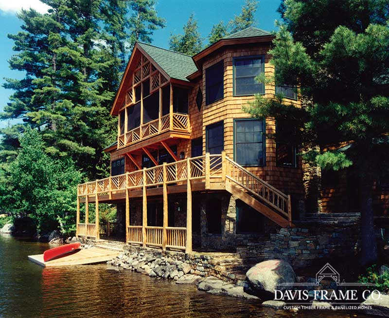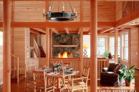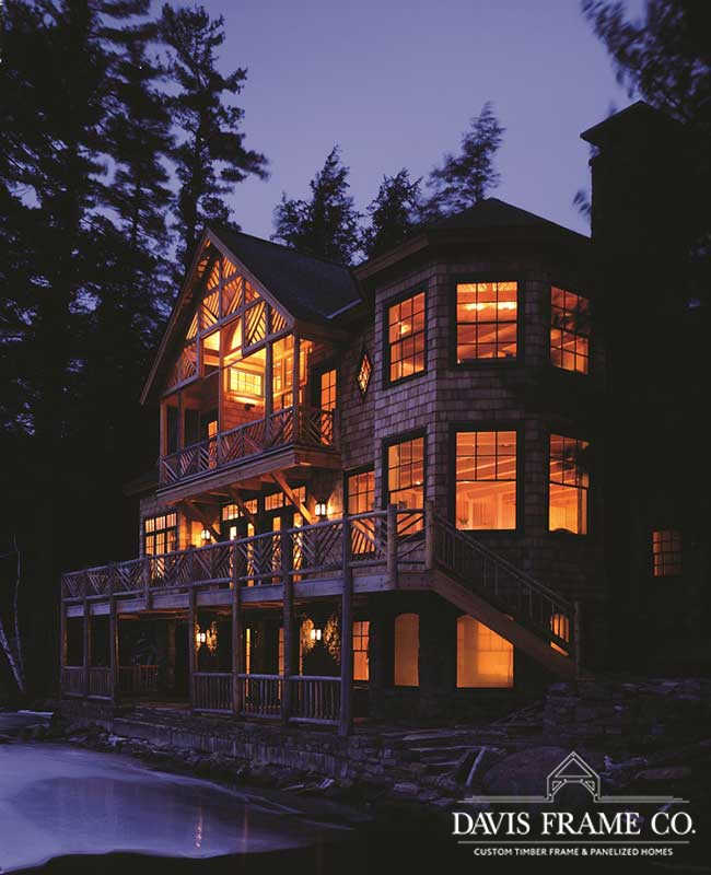 Nothing says lakeside living more than a traditional Adirondack style timber frame home. This classic beauty was designed and built to honor the traditional Adirondack architectural style. It blends seamlessly with the other “camps” on the lake. Appearing as a 1-story home from the driveway, one enters a foyer, off of which is the master suite to the left and a guest suite to the right. A sleeping porch connects the two suites in the back and shelters the lower level from the summer sun. Directly across from the front door a stairwell goes down into the open-plan dining, kitchen, and living room. The octagon section of the home connects to the original house that the client’s kept for their bedroom wing.