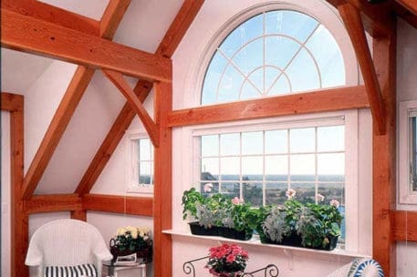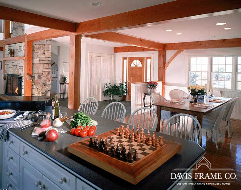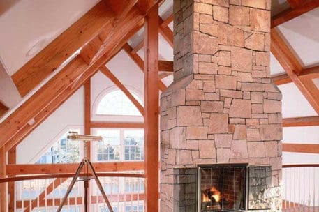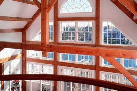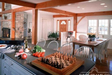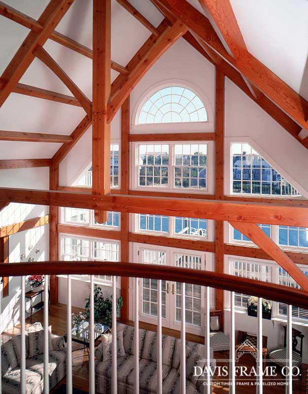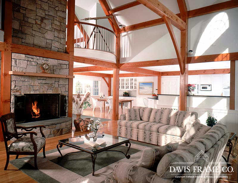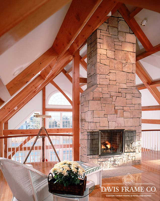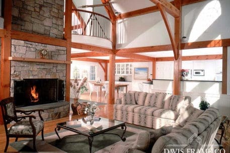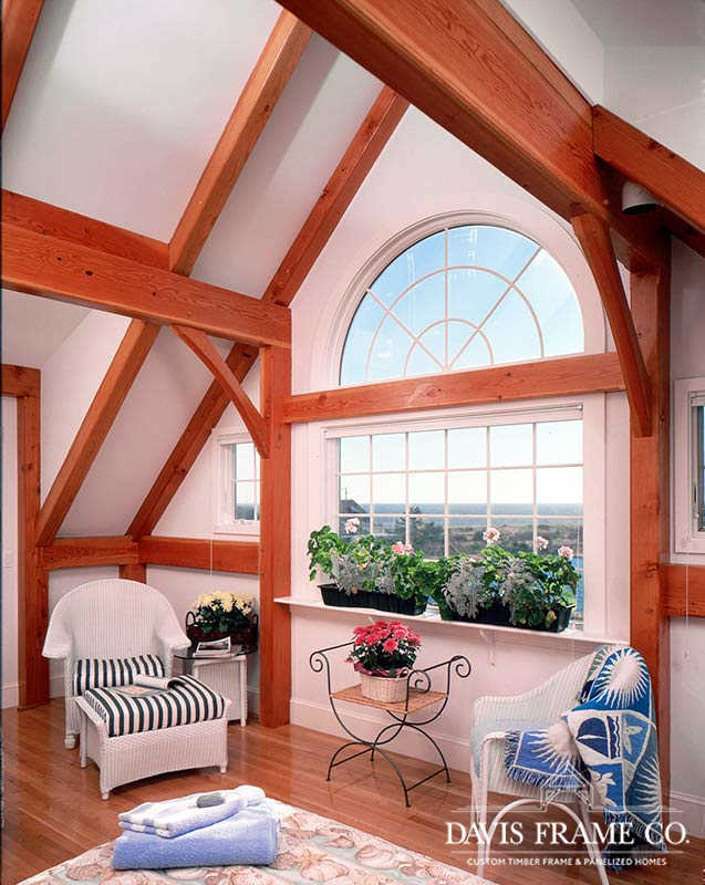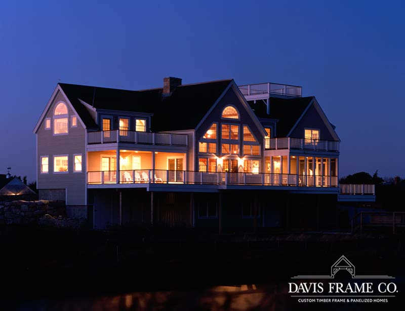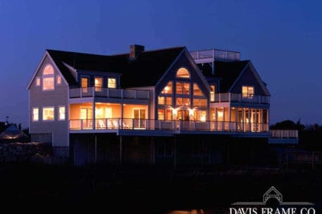Originally created for a Cape Cod ocean-front property, this gorgeous seaside timber frame home features a 26-foot cathedral ceiling combined with a wall of windows in the great room. The wall of windows offers a superb view of the water. A spacious first-floor master bedroom is intentionally set apart from the other living quarters on the second floor. The master bedroom has its own walk-in closet, ensuite bathroom, and private porch area. The abundant space on the second floor generously accommodates guests and family. All four bedrooms and the loft on the second floor take in a view of the ocean. Multiple decks and porches provide outdoor living areas where it’s easy to relax. Ideal for any waterfront property, this design also incorporates energy efficient design and green building technologies, including the use of SIPs.