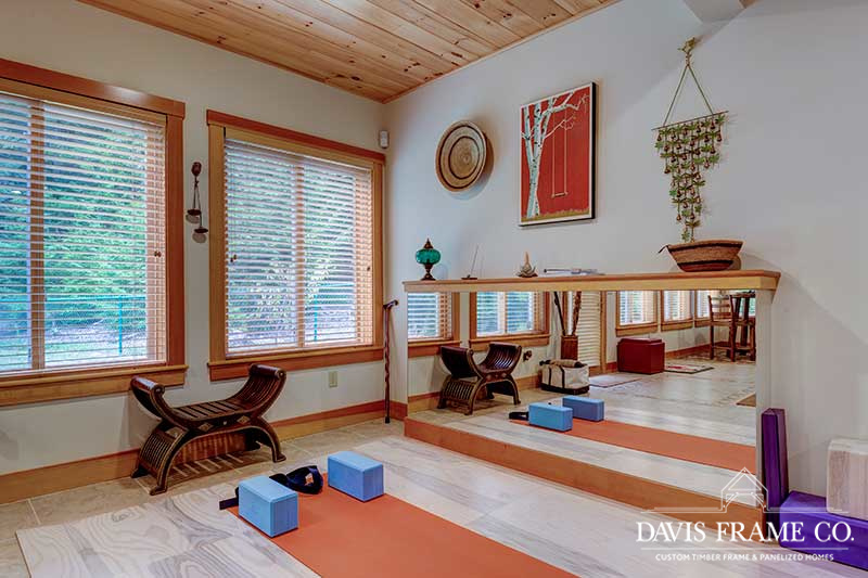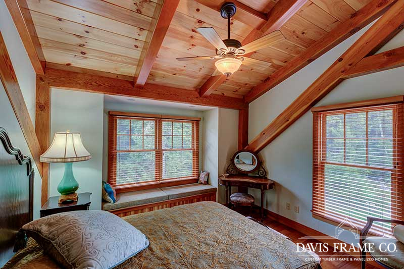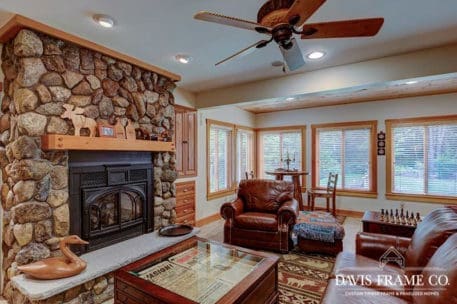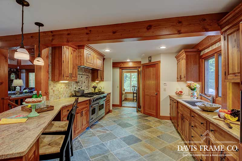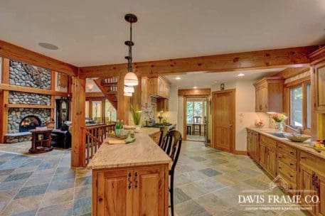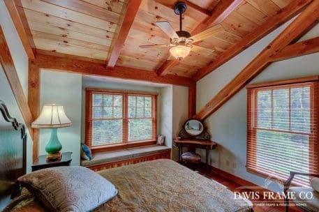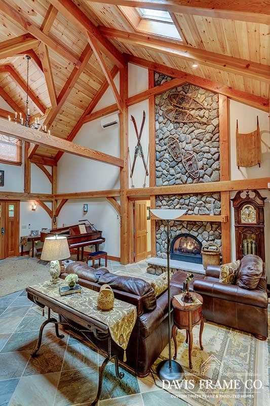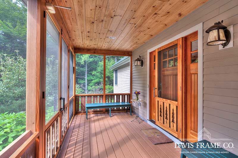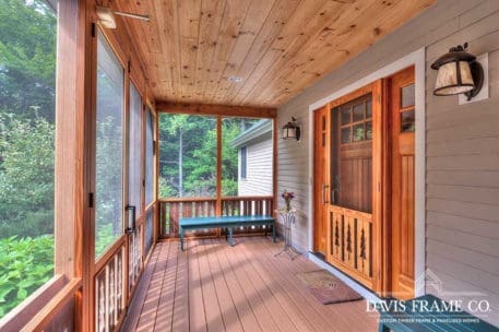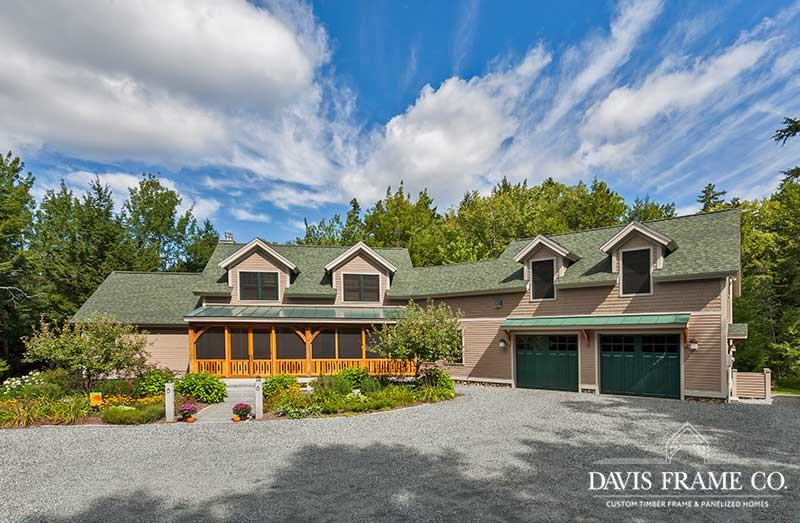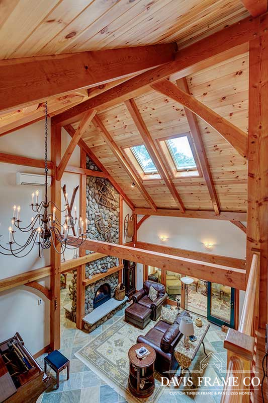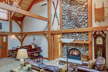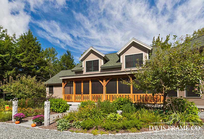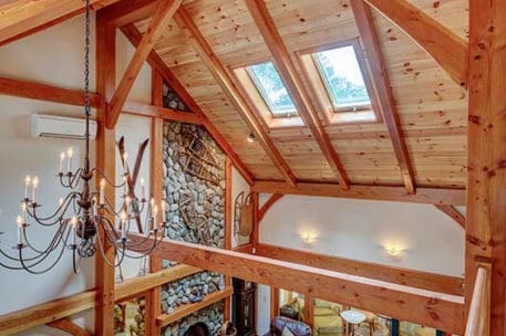 Aptly named for it's densely forested build site, from the outside The Woodland appears to be a typical New England style cape. Enter the home via the shady, screened porch and what seems to be a whole different home is revealed. The spacious eat-in kitchen opens up to a dining room on one side and a post and beam cathedral-style great room on the other. The floor-to-ceiling fieldstone fireplace and Douglas fir timbers lend a warm, cozy feel to the space while two large skylights give it a bright, airy feel. Venture upstairs for a bird's eye view of the main living are from the balcony.