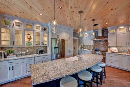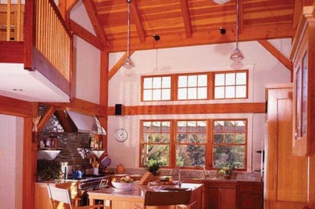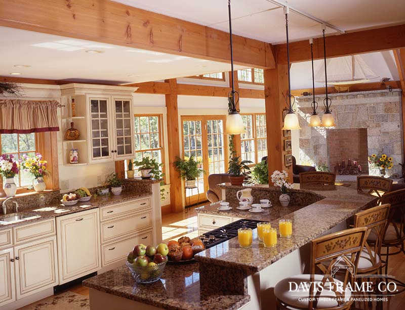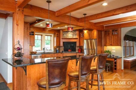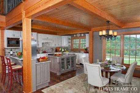 Many of our client’s timber frame kitchens are designed with entertaining in mind and flow into the great room and dining area to allow conversation between the guests and the homeowner chef. Other features often considered are, eat in areas such as an island with bar stools, breakfast nooks and specialty additions such as pizza ovens, warming stations, water spouts near the stove and so much more.