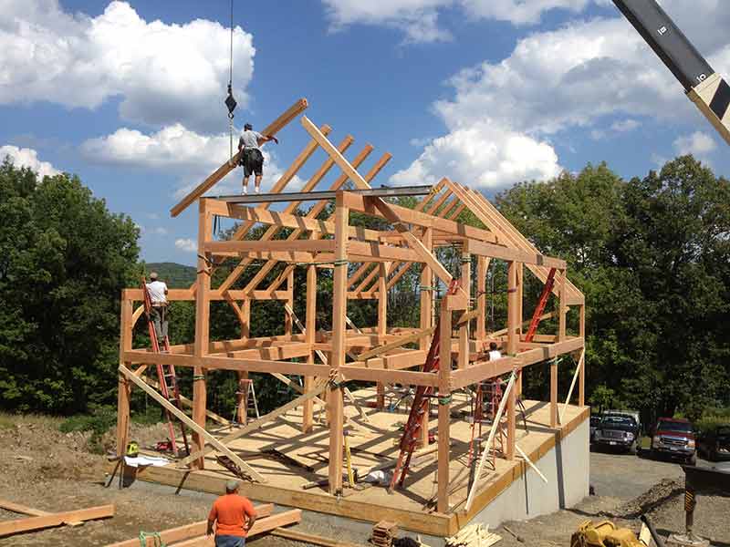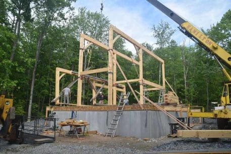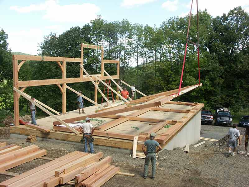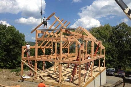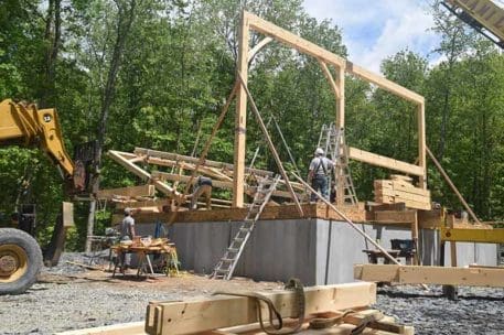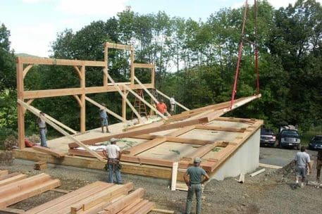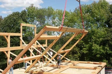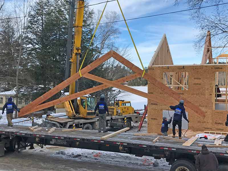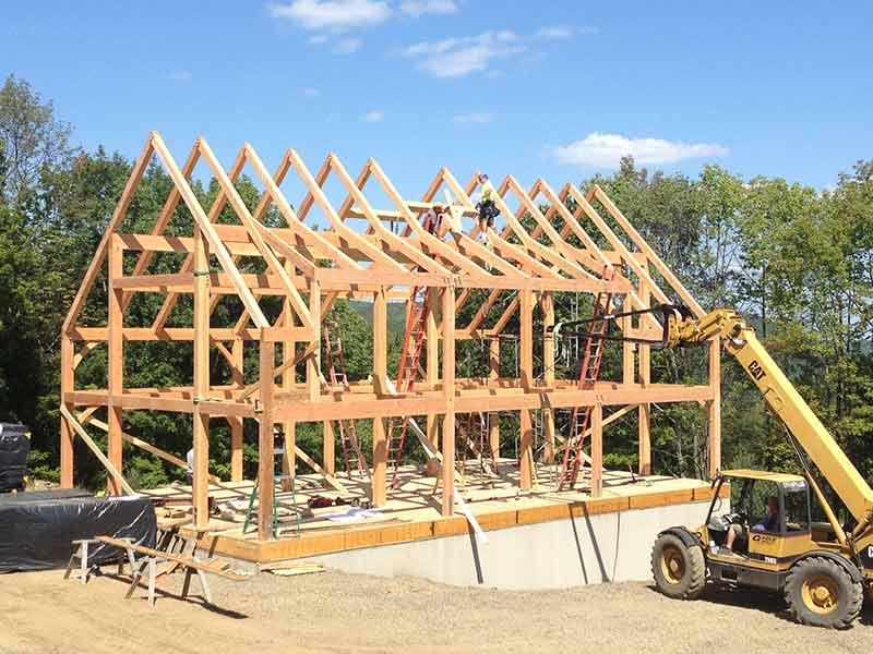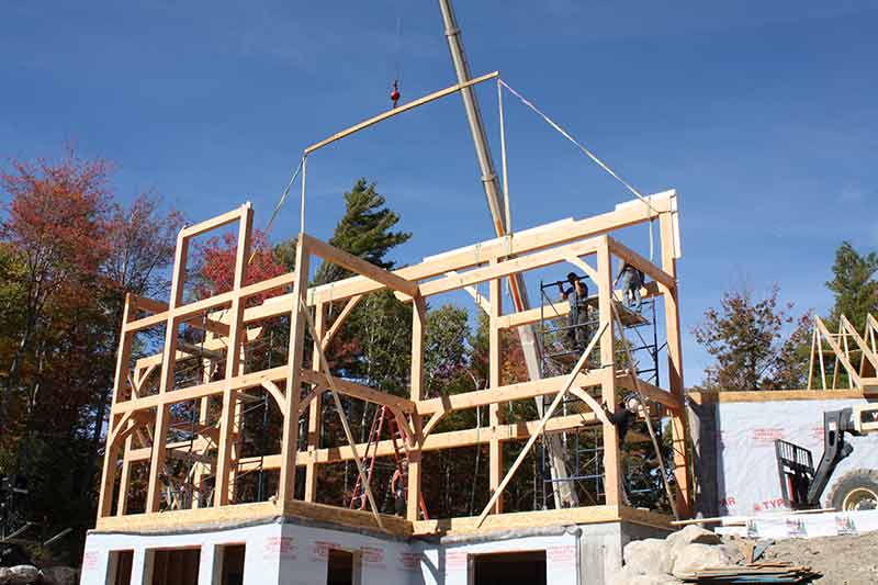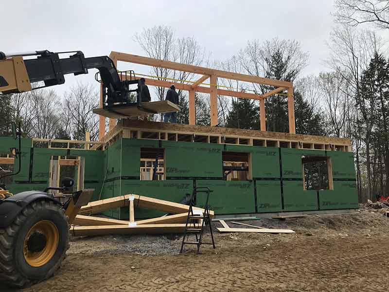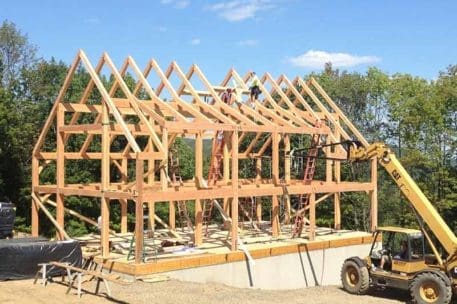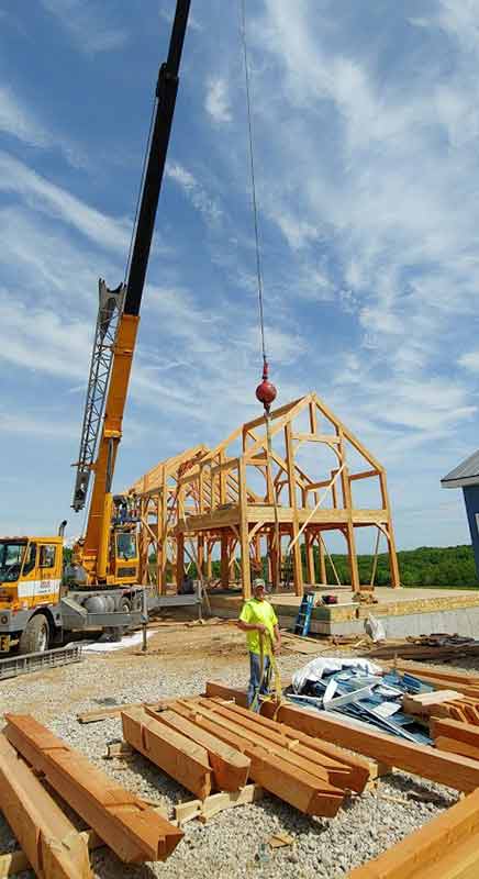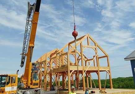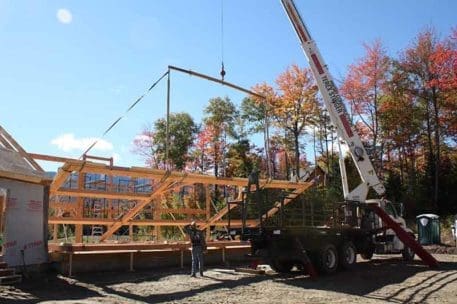 Ever wonder how one of our homes are built? Our timber frame and panelized structures go up much quicker when compared to conventionally framed homes and offer little to no waste, making it an eco-friendly option to consider. Once the timber frame is done in our shop, we ship it via flatbed trucks to the job site. With our timbers being pre-cut, it makes for a fast install! Typically, our frames can be raised within 3 days depending on the size of the job.