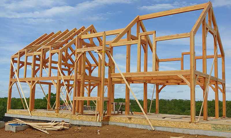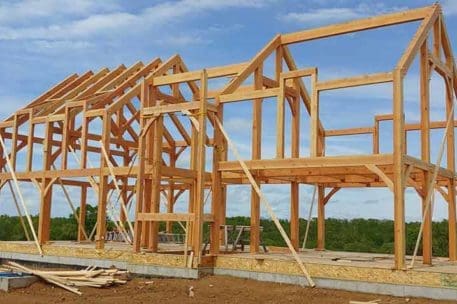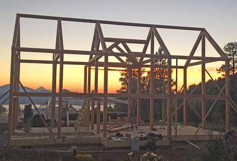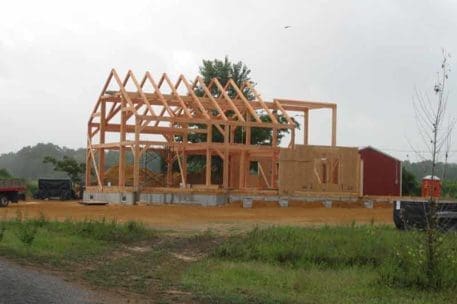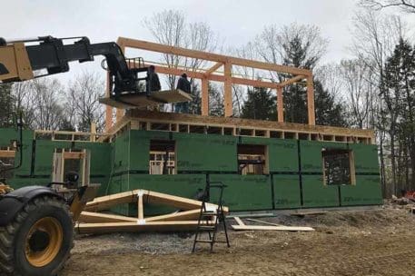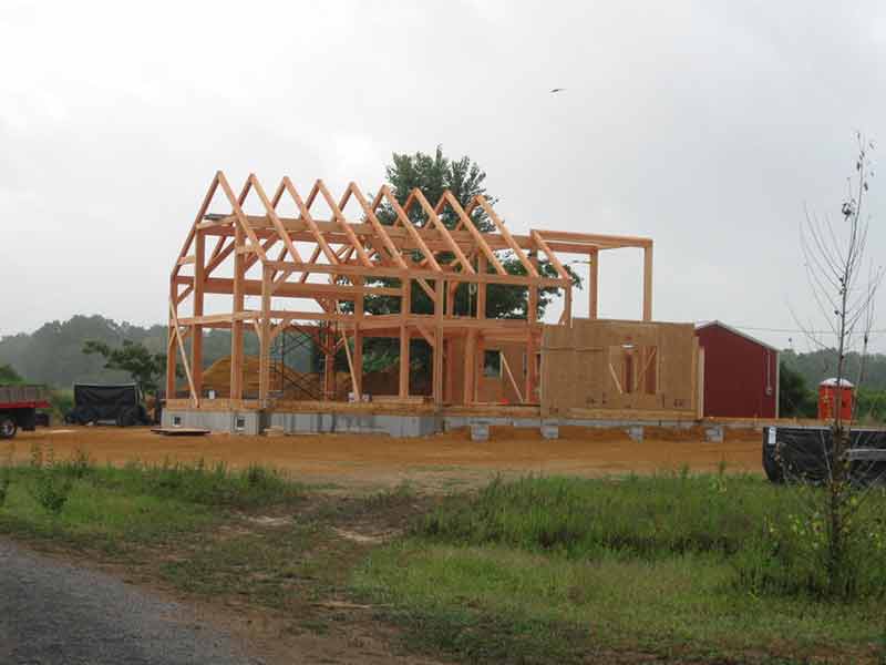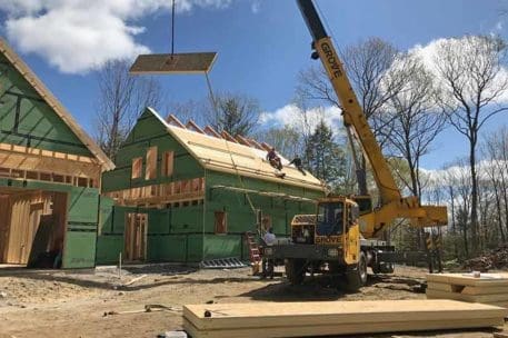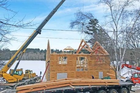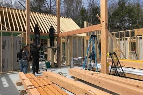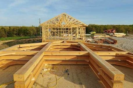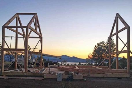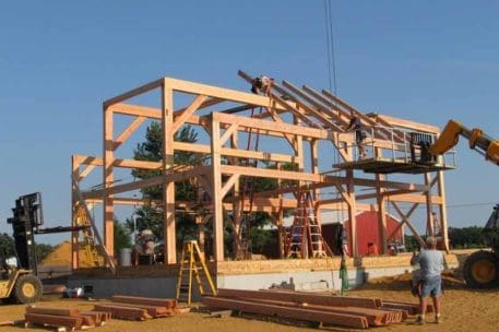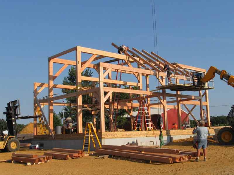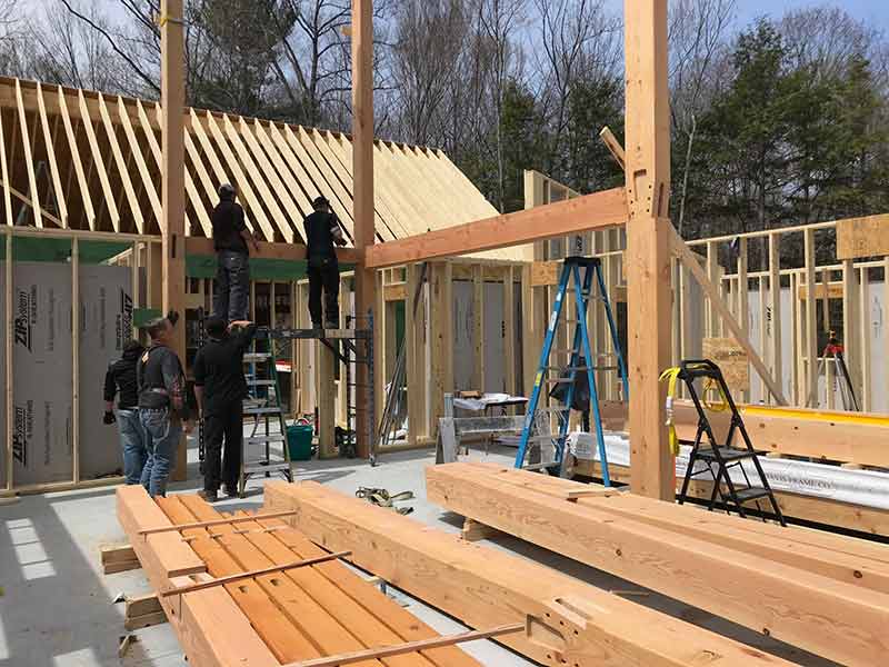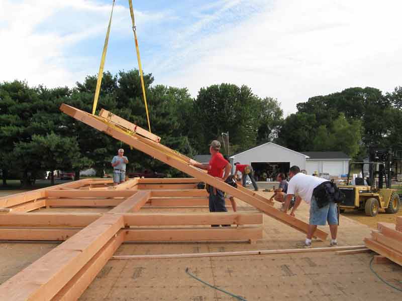 Ever wonder how one of our homes are built? Our timber frame and panelized structures go up much quicker when compared to conventionally framed homes and offer little to no waste, making it an eco-friendly option to consider. Once the timber frame is done in our shop, we ship it via flatbed trucks to the job site. With our timbers being pre-cut, it makes for a fast install! Typically, our frames can be raised within 3 days depending on the size of the job.