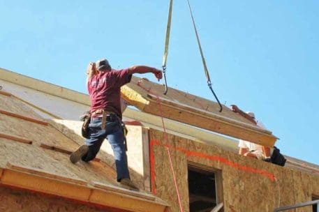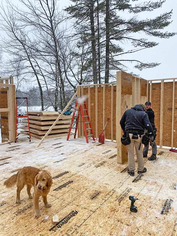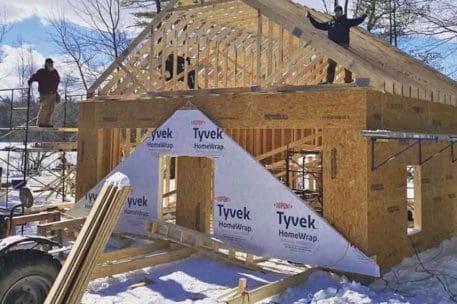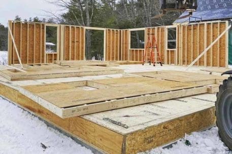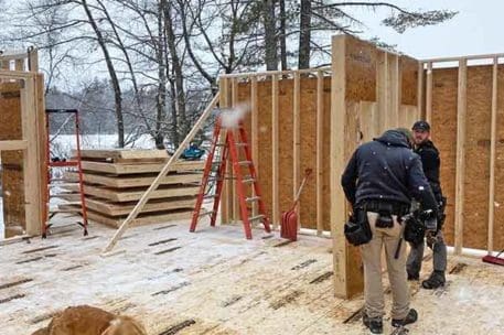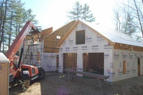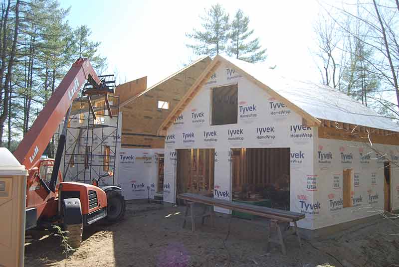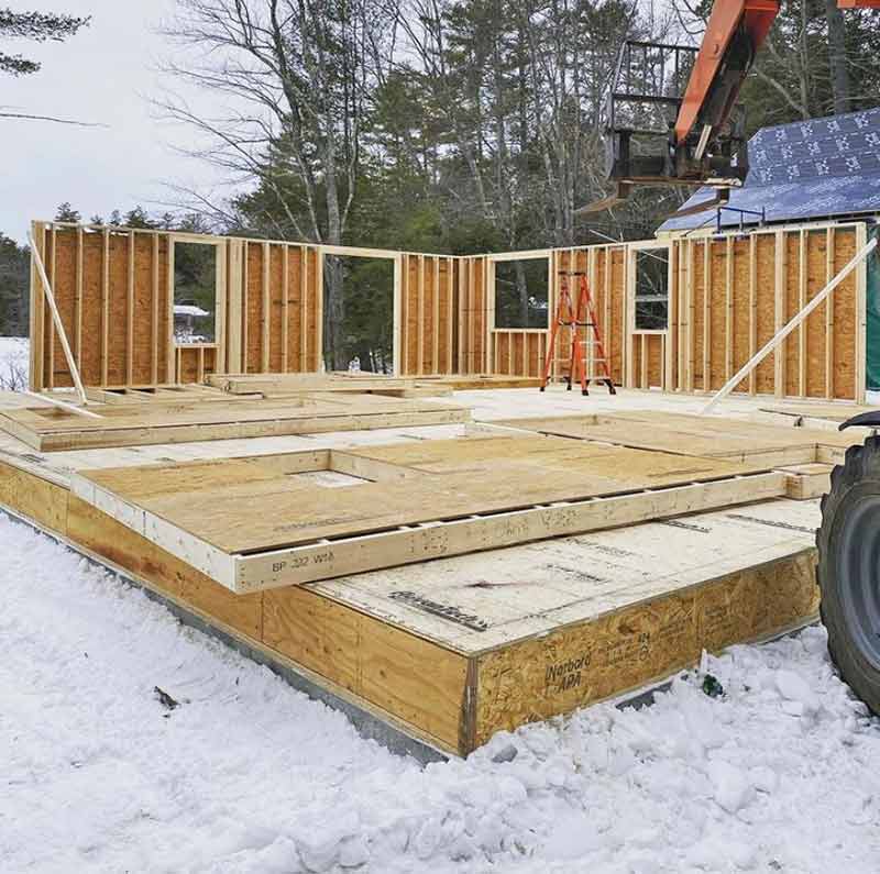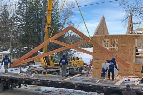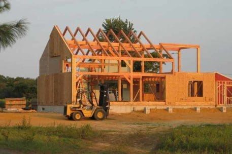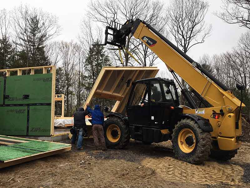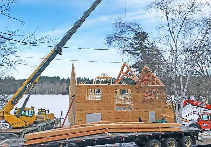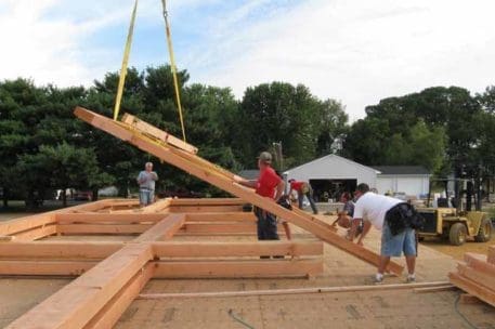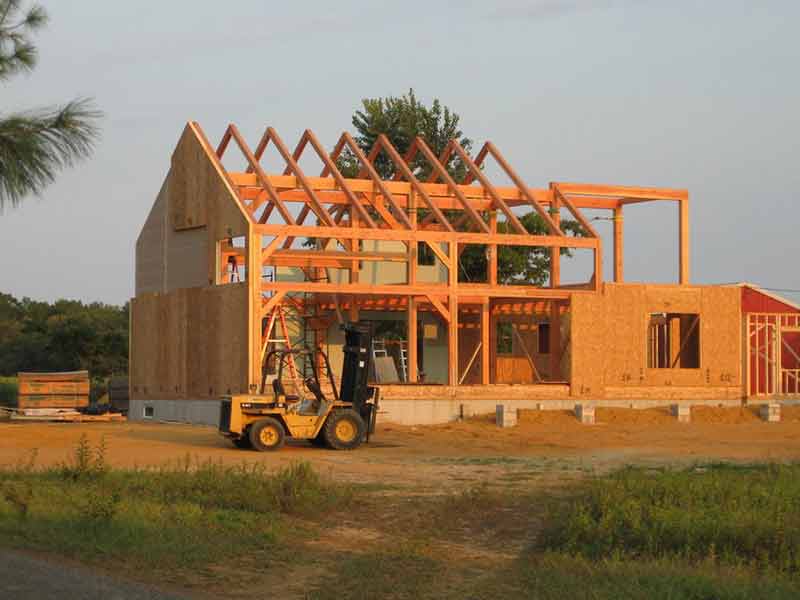 Ever wonder how one of our homes are built? Our timber frame and panelized structures go up much quicker when compared to conventionally framed homes and offer little to no waste, making it an eco-friendly option to consider. Once the timber frame is done in our shop, we ship it via flatbed trucks to the job site. With our timbers being pre-cut, it makes for a fast install! Typically, our frames can be raised within 3 days depending on the size of the job.