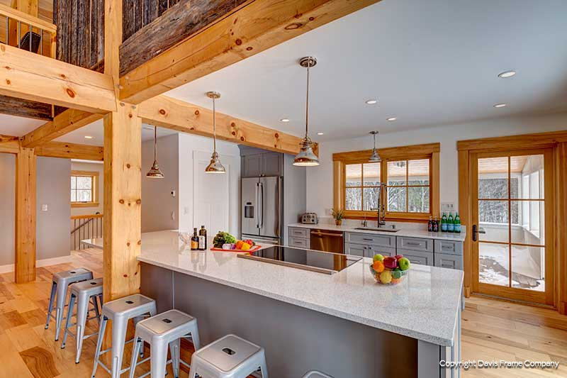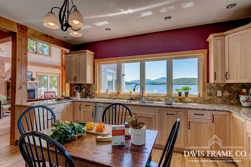 Located in Vermont, this hybrid timber frame home features a conventional style kitchen. It features classic wood cabinets that tie in nicely with the timber frame great room located just beyond the kitchen.