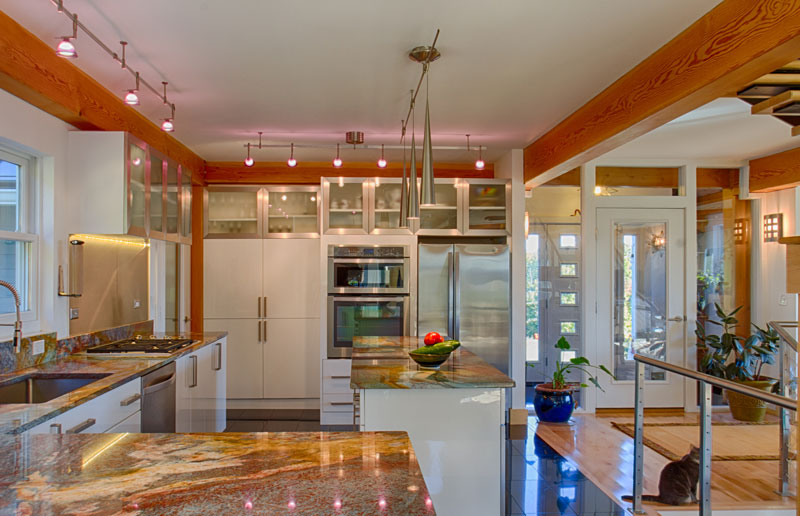 Shown above is one of our panelized homes that our client’s built in the suburbs of Boston. The kitchen features charcoal gray cabinets for the bottom and there is a wall of white cabinets. This combination looks amazing together and works nicely with the contemporary home-style.